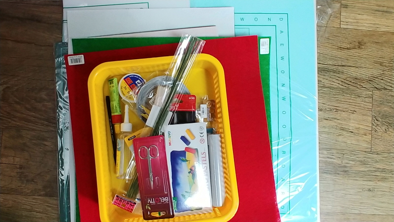 오만 오천 원 정도를 사 와놓고 보니 집에 대부분 있는 재료들을 또 사 온 것이 많다. 그래도 일부 새 식구가 생겼으니 중년이 되어서도 두근거린다. 문구점은 어쩜 여자들이 백화점 가는 기분을 이해하게 해 주는 것 같다. 마냥 있어도 좋은 곳이다. 이걸 살까 저걸 살까.... 있는 것을 또 사도 좋다! 적은 금액으로 이렇게 만족감을 주는 쇼핑이 얼마나 될까?