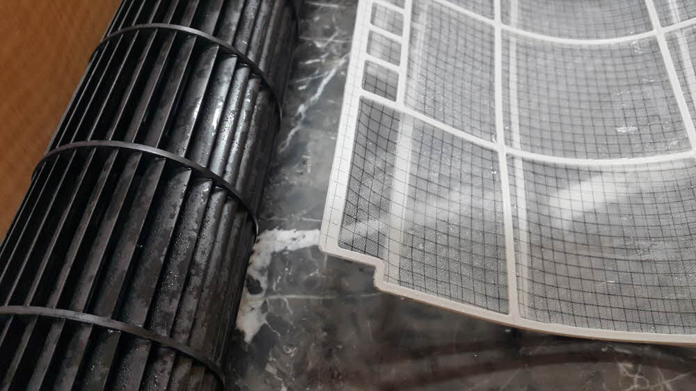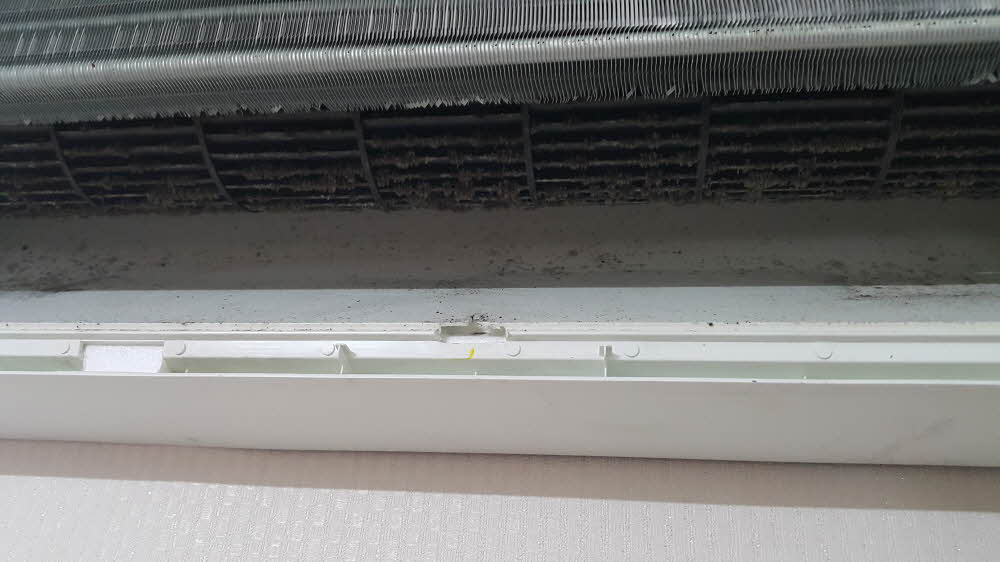 열 교환기(애바?)는 비교적 깨끗해 보이지만 그 뒤에 숨어있는 곰팡이들...특히 원통형 선풍기 날개에 곰팡이가 한가득!
