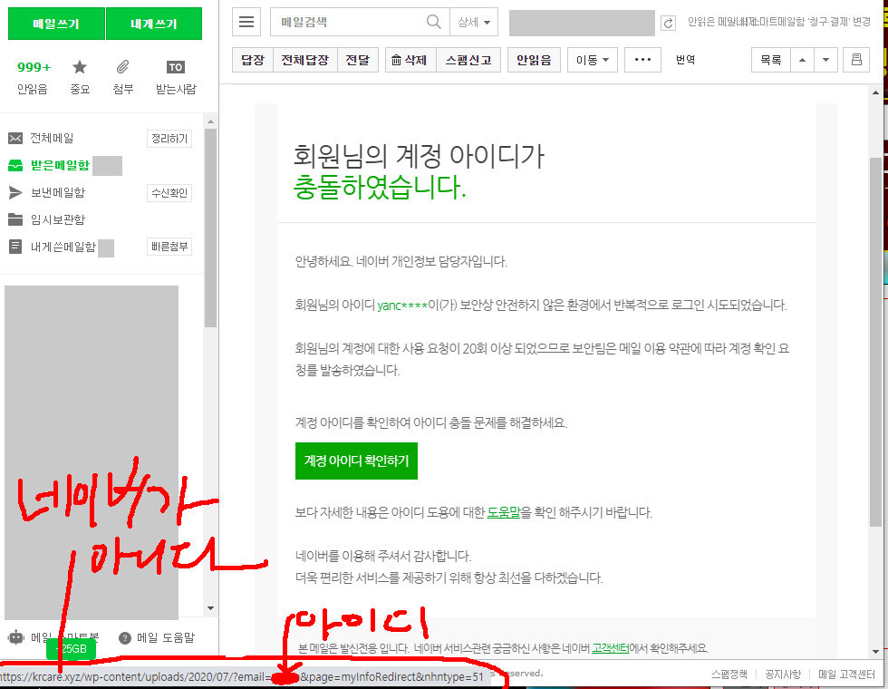 중앙의 녹색 버튼(계정아이디 확인하기)을 누르면 하단의 주소로 날아가게 되어있다. 아마 내 아이디를 어디선가 주워서 낚시를 하려했던 모양이다.
